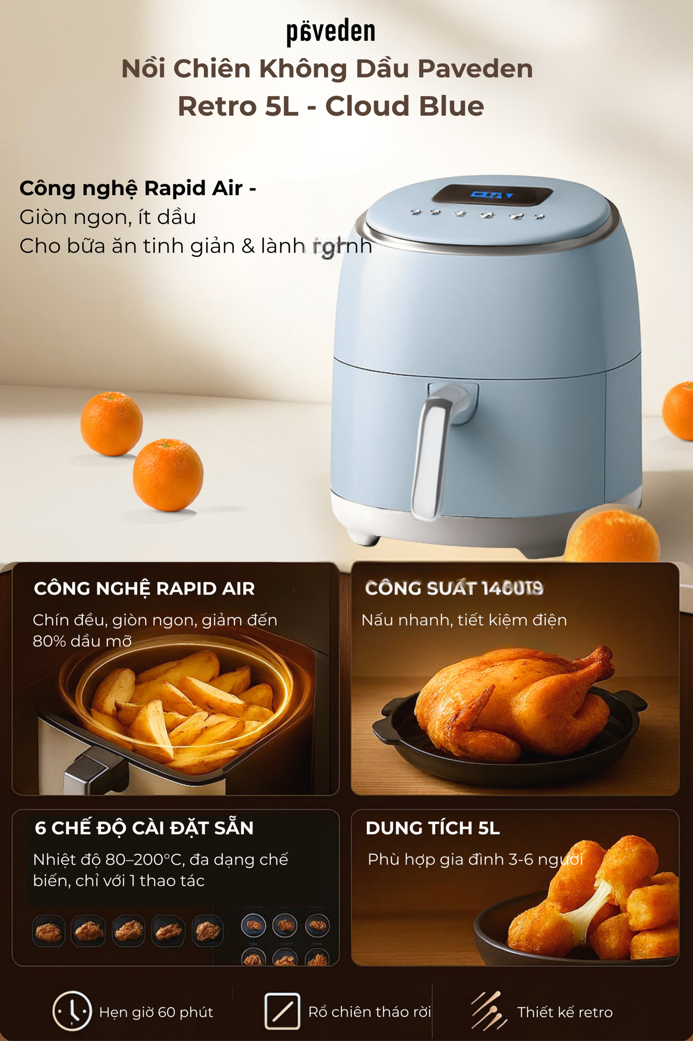 Nồi chiên không dầu Paveden Retro kết hợp hài hòa giữa thẩm mỹ retro và công nghệ tiện nghi, mang lại trải nghiệm nấu nướng tinh giản nhưng hiệu quả: